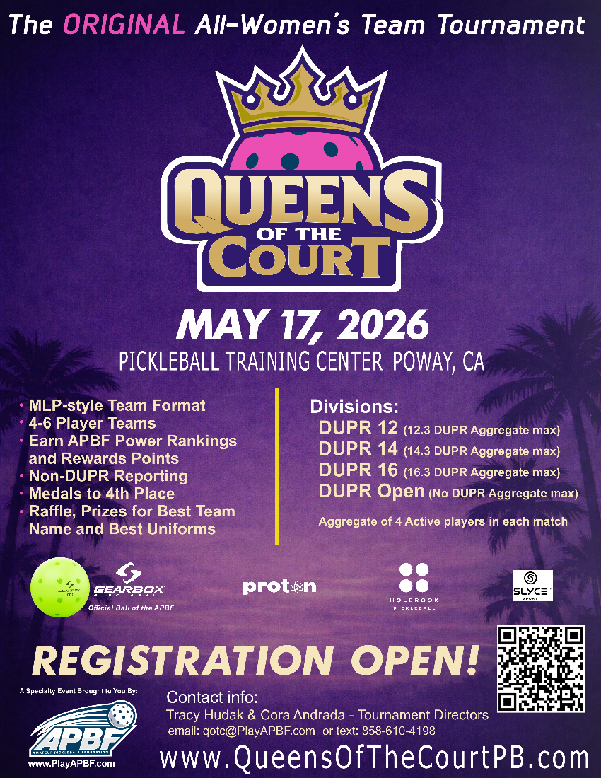 Queens of the Court returns on May 17, 2026 at Pickleball Training Center in Poway, CA. This all-women's event features an MLP-style team format with 4-6 player teams, DUPR-based divisions, APBF Power Rankings and Rewards Points, medals through 4th place, and raffle prizes for best team name and best uniforms.